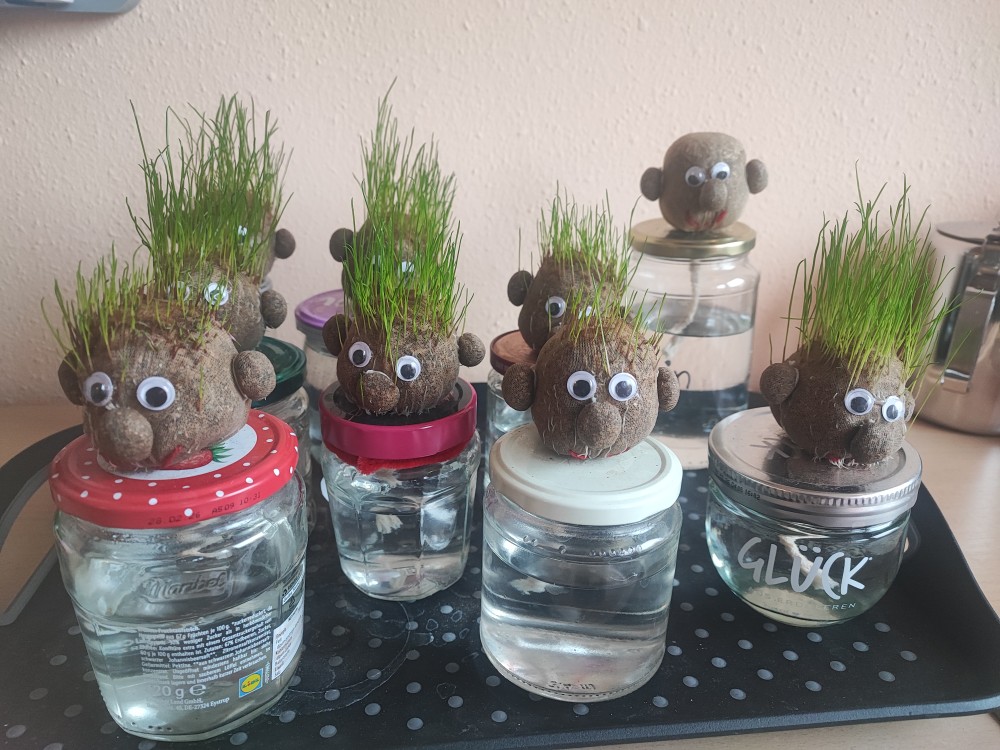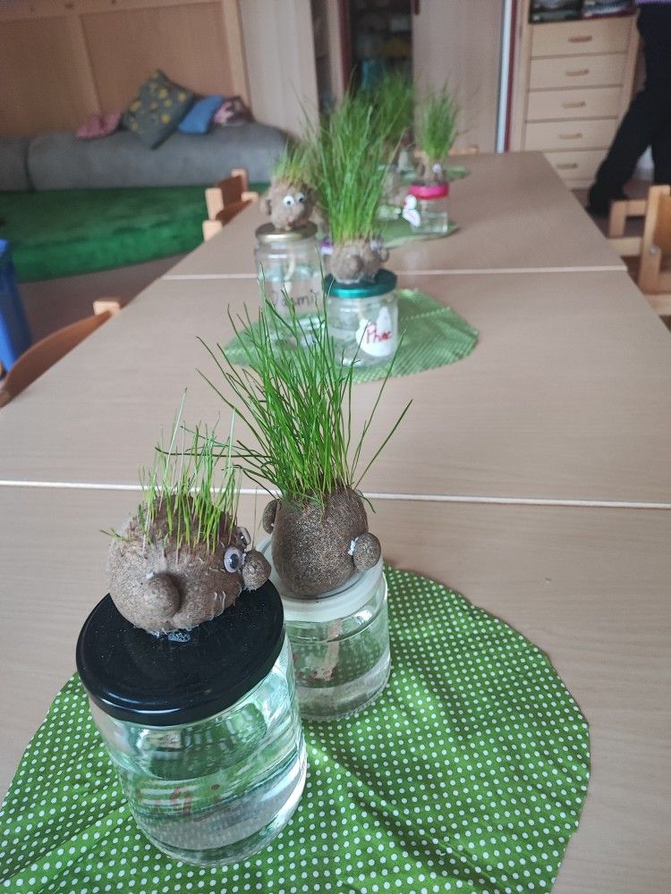 Damit die Grasköpfe- von den Kinder auch liebevoll „Franklin“ genannt- prächtig gedeihen konnten, war einiges an Vorarbeit nötig: Da musste vorsichtig ein Loch in den Deckel gehämmert werden und damit die Kinder sich nicht an den scharfen Kanten schneiden, wurde alles sorgsam mit von den Kinder geschnittenen Tesafilmstreifen gesichert. Nun konnten die Kinder die Gläser mit Wasser füllen und der Graskopf mit dem Docht auf dem Glas befestigt werden. Und siehe da: Nach wenigen Tagen hatten die Grasköpfe eine grüne Stoppelfrisur. Wenn die „Haare“ noch länger werden, können die Kinder ihren „Franklin“ frisieren….