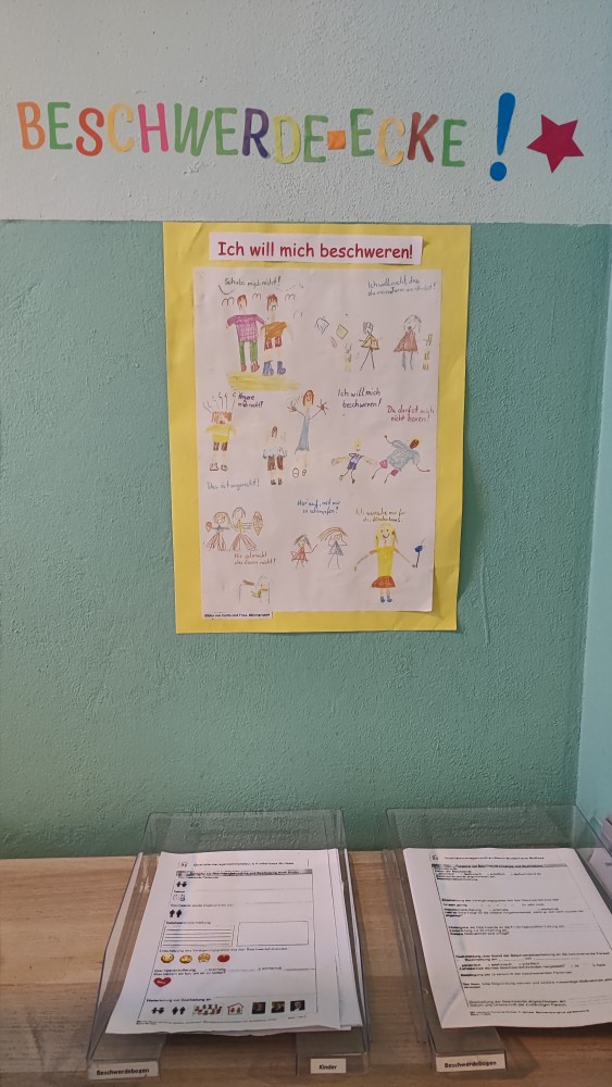 Für Anliegen die nicht direkt geklärt werden können, haben wir im Anbau die Beschwerdeecke eingerichtet. Hier können sich die Kinder ein Beschwerdeformular nehmen und ihn gemeinsam mit einer Person ihrer Wahl ausfüllen, um diesen dann an die zuständige Person weiterzugeben.